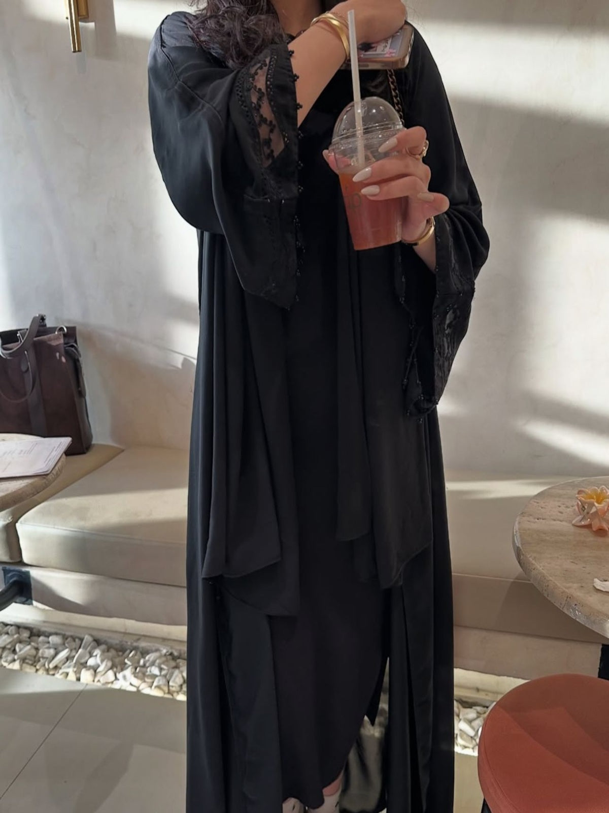 Black Georgette Open Abaya paired with a plain scarf. The sleeves are crafted with organza lace details and beads.