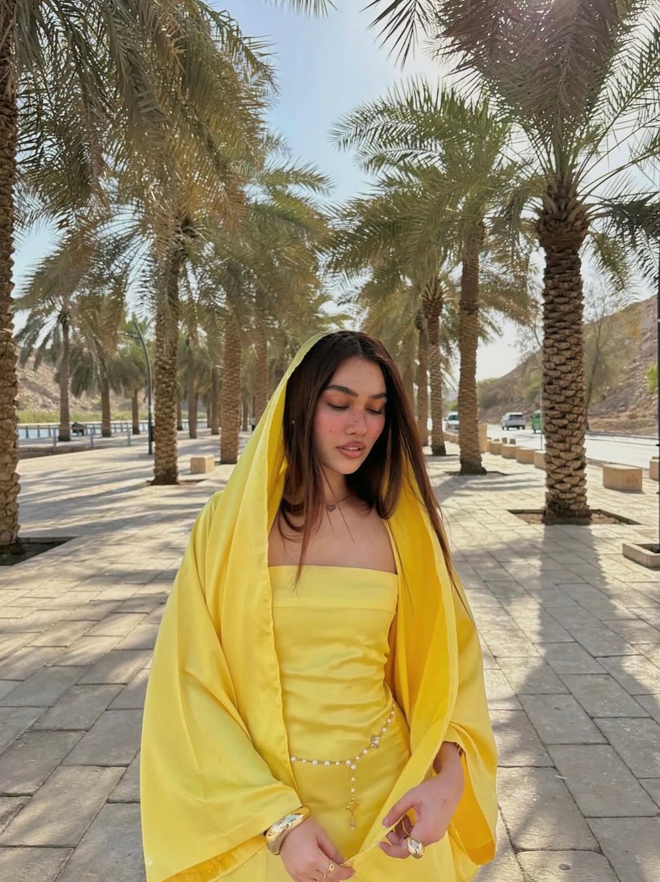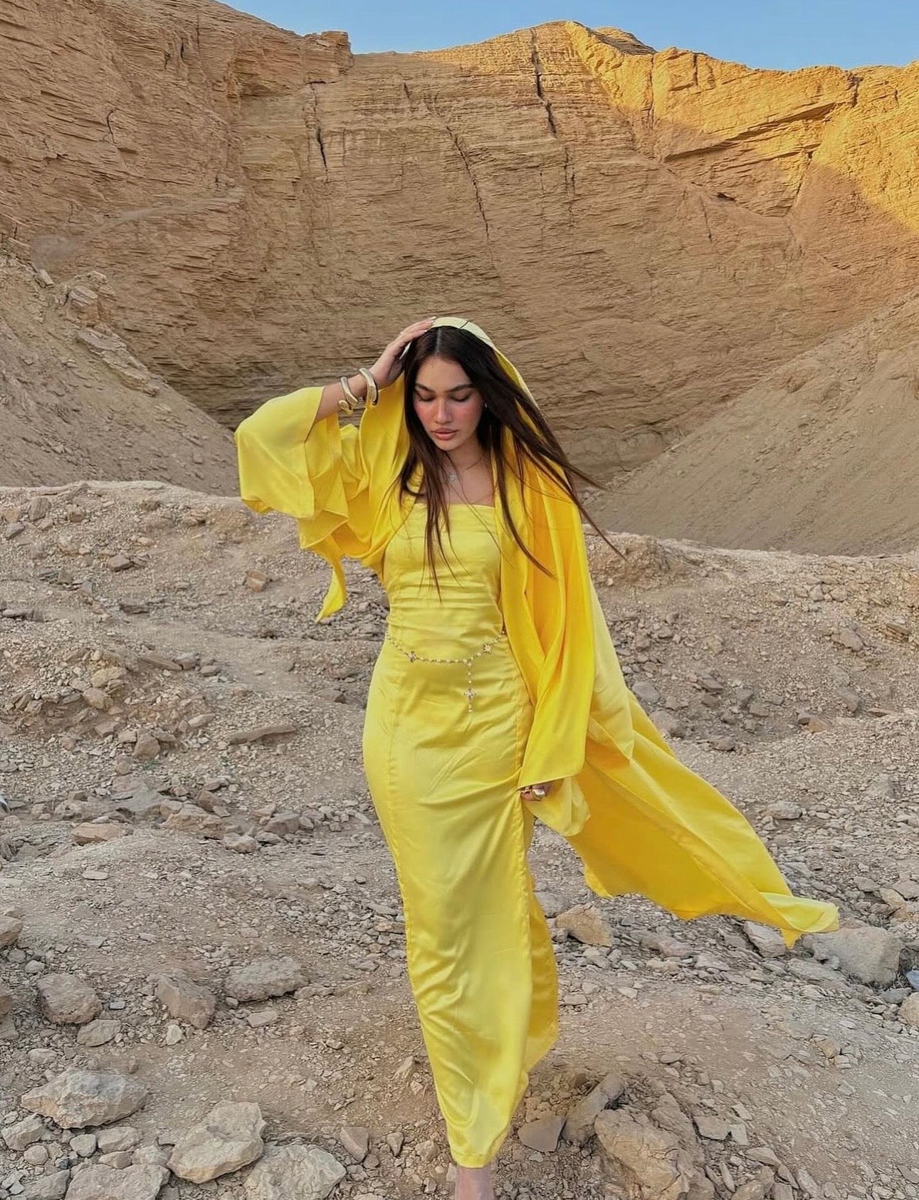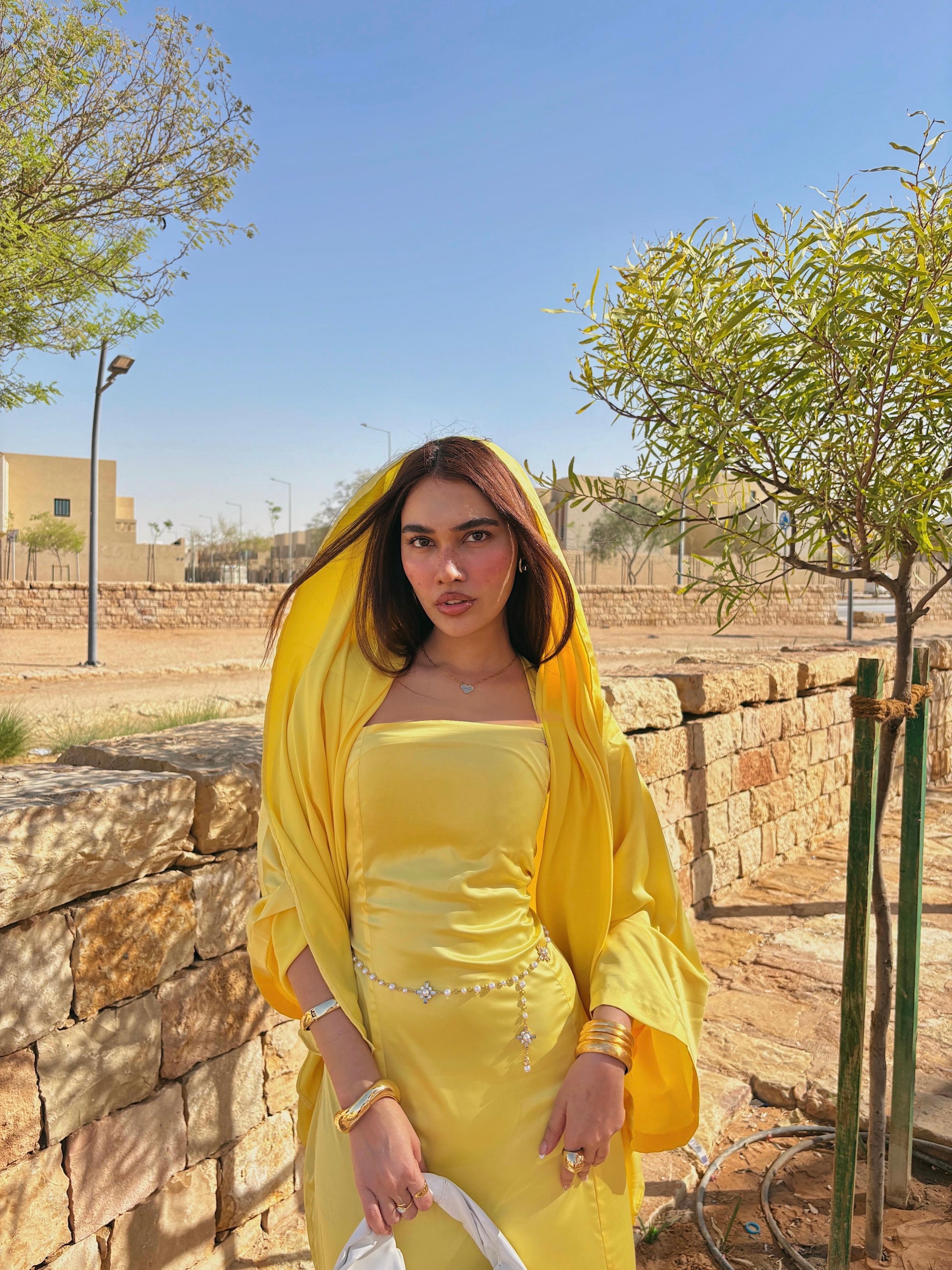 Belle Lumière - a radiant yellow open abaya paired with an inner dress, designed to move effortlessly from day to evening.