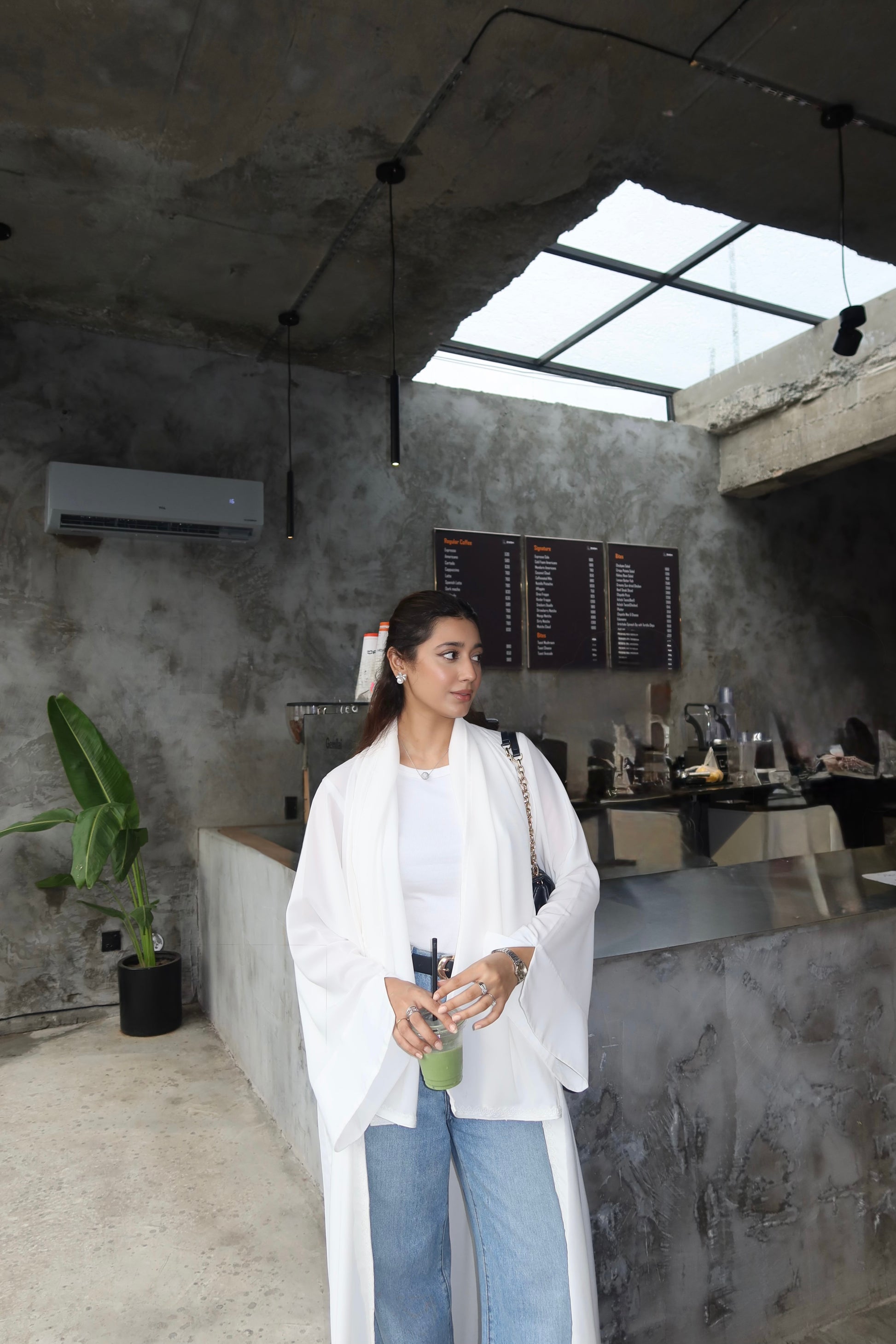 Our White Georgette Open Abaya is crafted from lightweight, flowy fabric that drapes effortlessly for a refined silhouette. The front panels are delicately adorned with fine white lace, adding a touch of understated femininity and sophistication. Paired with a matching scarf featuring the same lace detail, this abaya is the perfect balance of minimalism and luxury.